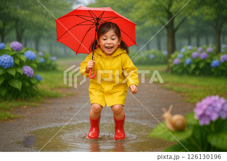 梅雨の時期、楽しそうに公園の水たまりにジャンプする女の子