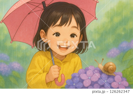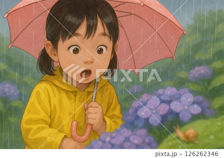 梅雨の公園を歩くレインコート姿の幼い女の子|紫陽花と小雨が彩る季節の写真風イラスト