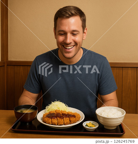 とんかつ定食に笑顔の外国人観光客|日本の食文化、日本食を楽しむ瞬間