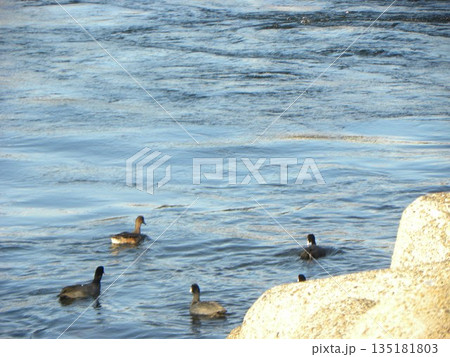 検見川浜の岸壁に冬に来る渡り鳥ヒドリガモとユリカモメ