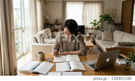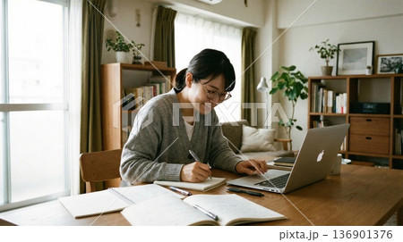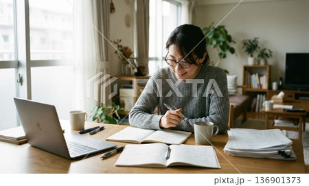 自宅でノートを見ながらパソコンでテレワークをするミドル世代の女性