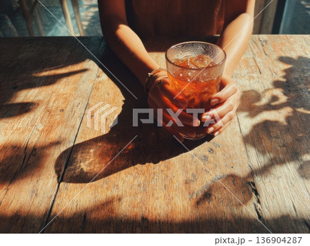 木漏れ日差し込むカフェでアイスラテを持つ手元写真