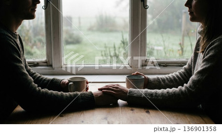 窓辺のテーブルで手を重ね合いコーヒーを飲むカップル