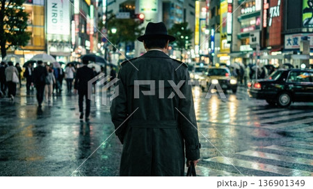 雨上がりの夜の新宿を歩くトレンチコートの男性の後ろ姿
