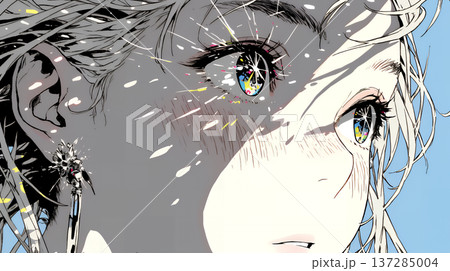 輝く瞳で見つめる好奇心旺盛な若い女性(シンプルな色使い)