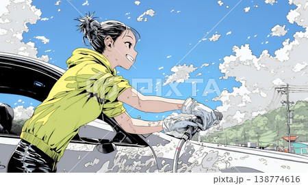 晴れた日に洗車をする若い女性|青空と水しぶきの爽やかなライフスタイルシーン