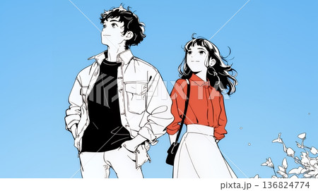 幸せそうなカップル:散歩中(シンプルな色使い)