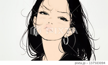 嫉妬の表情を浮かべる若い女性(シンプルな色使い)