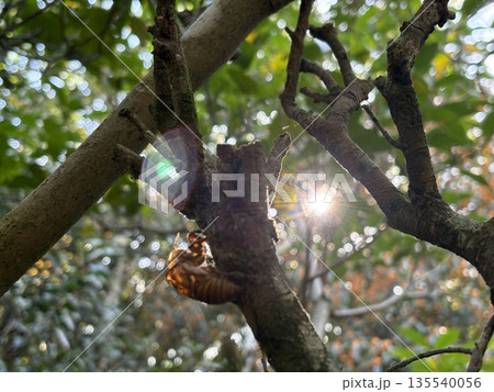 蝉の抜け殻と木漏れ日