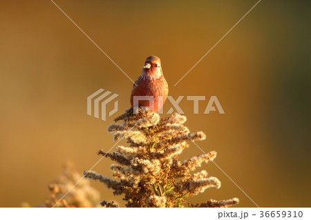 ベニマシコ雄と枯れたセイタカアワダチソウ