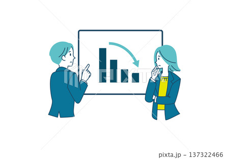 右肩下がりのグラフを見て分析する男女のイラスト