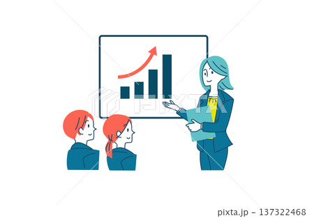 上昇するグラフを見ながら説明する女性のイラスト